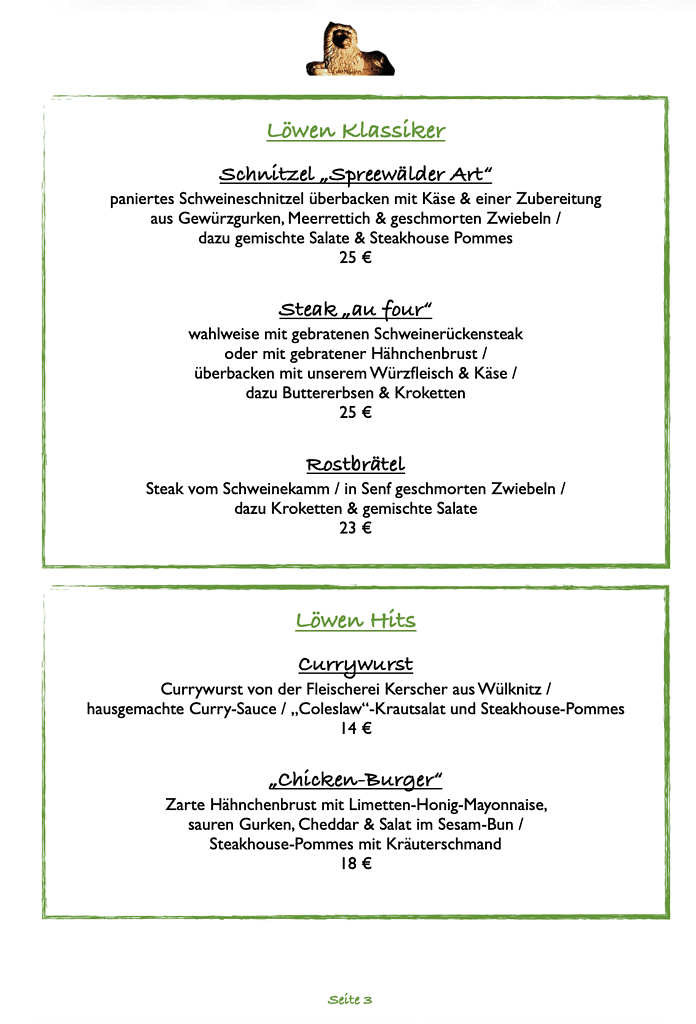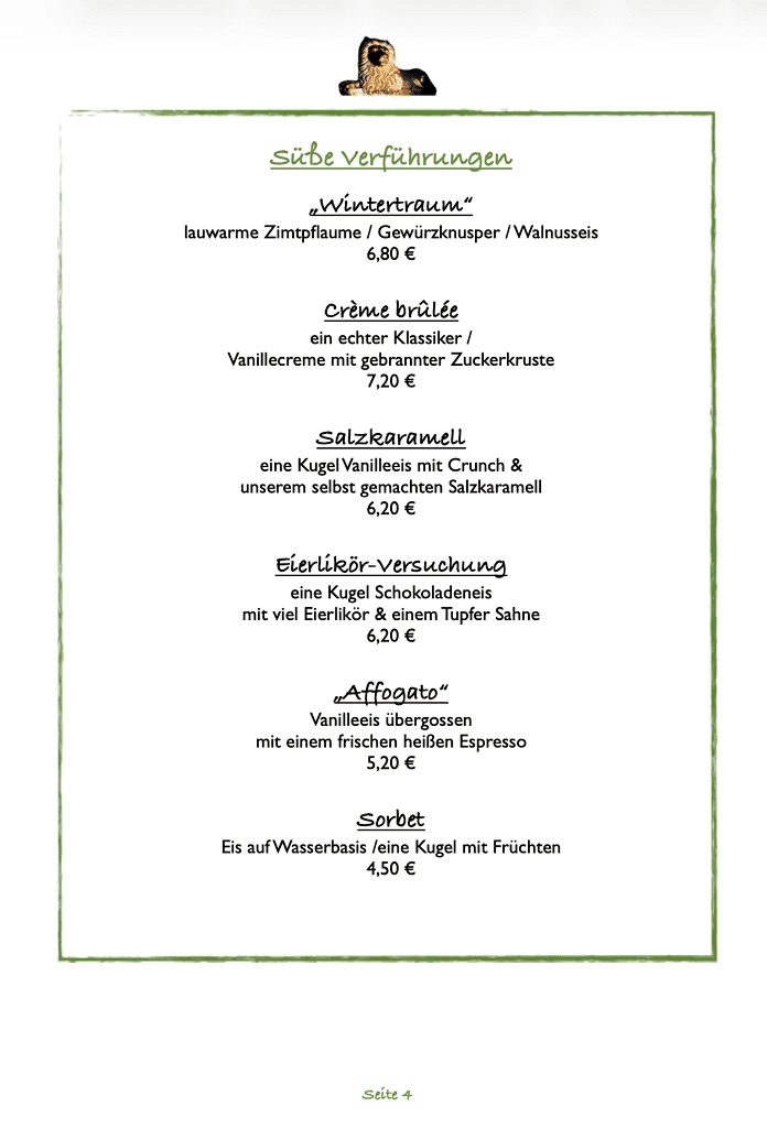 Essen nach Karte (die aktuelle Speisekarte finden Sie immer aktuell auf unserer Webseite)
