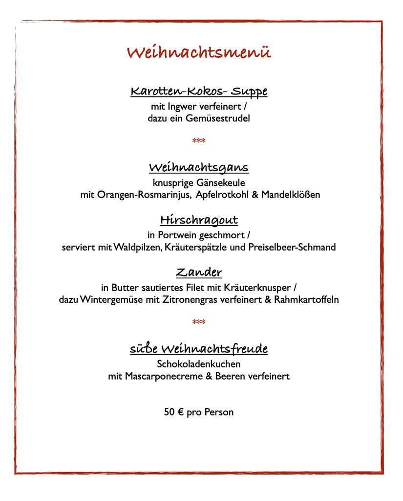 Am 25. und 26. Dezember heißen wir Sie mittags herzlich willkommen und servieren Ihnen ein festliches 3-Gänge-Menü.