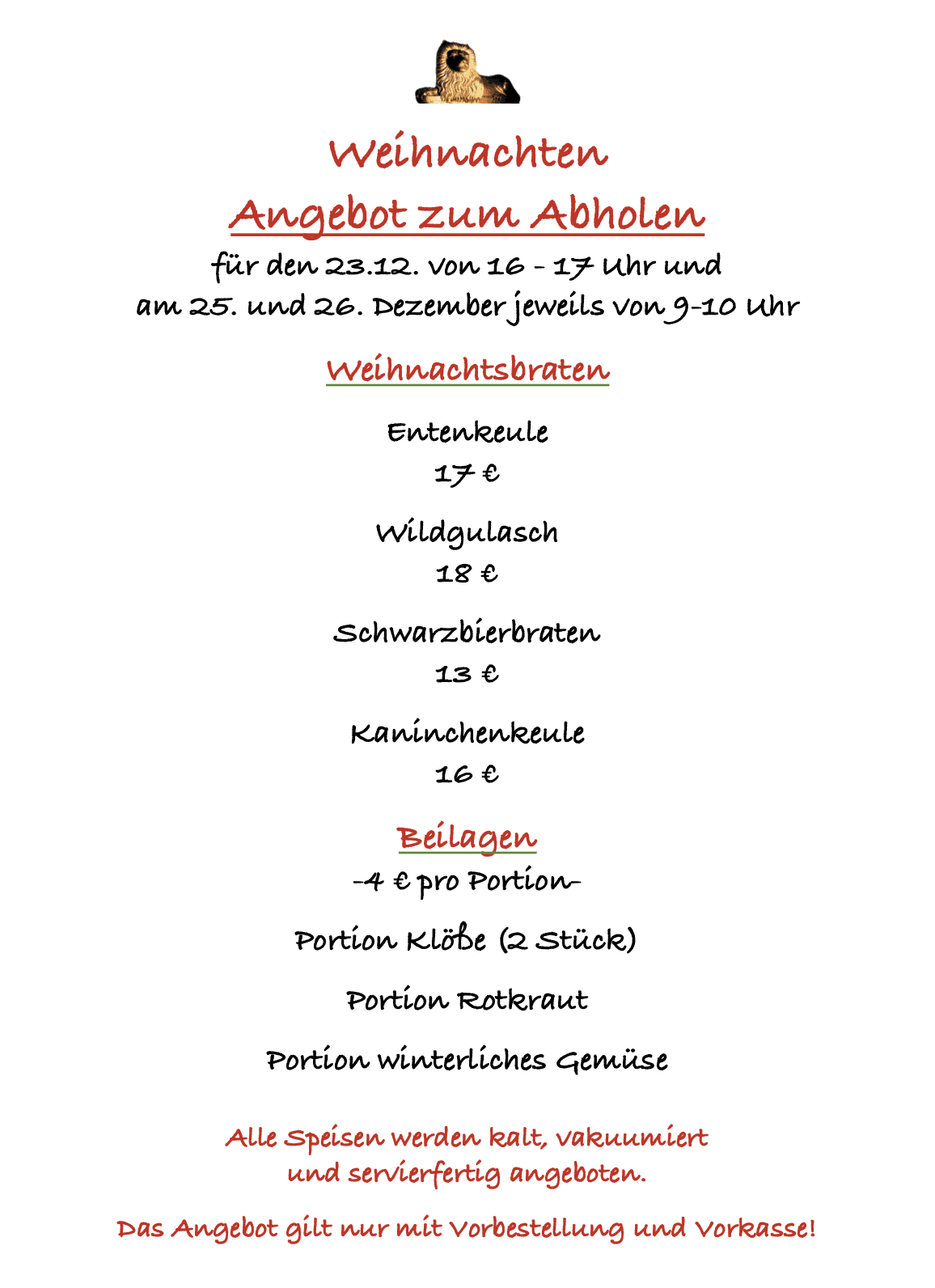 Da unser Restaurant an beiden Weihnachtsfeiertagen bereits ausgebucht, bieten wir Ihnen auch die Möglich zur Abholung an 🎁.